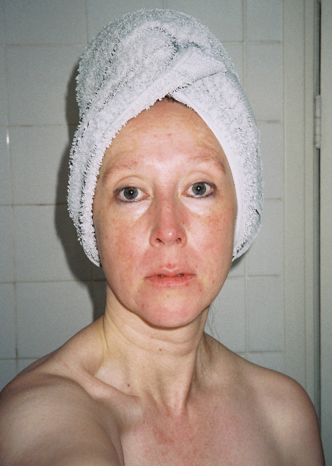 The selfie installation “42 Days with Hair Towels (2005-2025)” depicts moments spanning 20 years when the artist emerges from the shower with a towel wrapped around her head. She gradually ages in an unfiltered way.